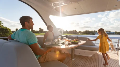 • Eine glückliche Familie entspannt auf der Schwimmplattform ihrer gereinigten Princess Y80 nach dem Frühjahrsputz.
