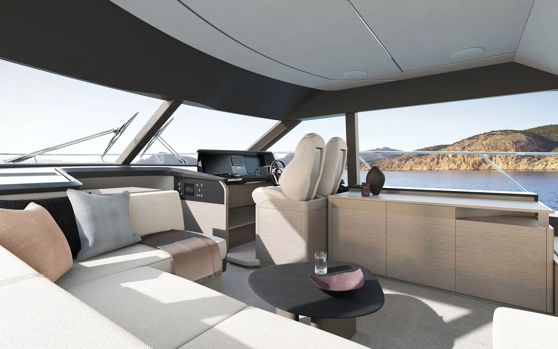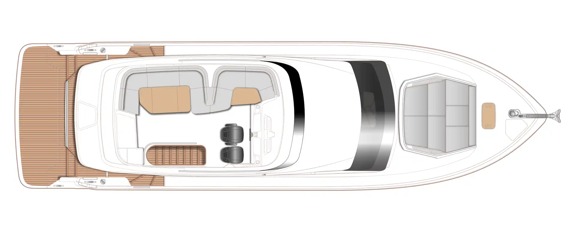 Schon beim Betreten beeindruckt die neue Princess F54 mit edlem Teakdeck, großzügiger Flybridge und modernem Layout. Die optionale Wetbar, wandelbare Sonnenliege und eleganten Sitzbereiche machen das Oberdeck zum perfekten Ort für entspannte Stunden – auf Wunsch geschützt durch ein stilvolles Hardtop.