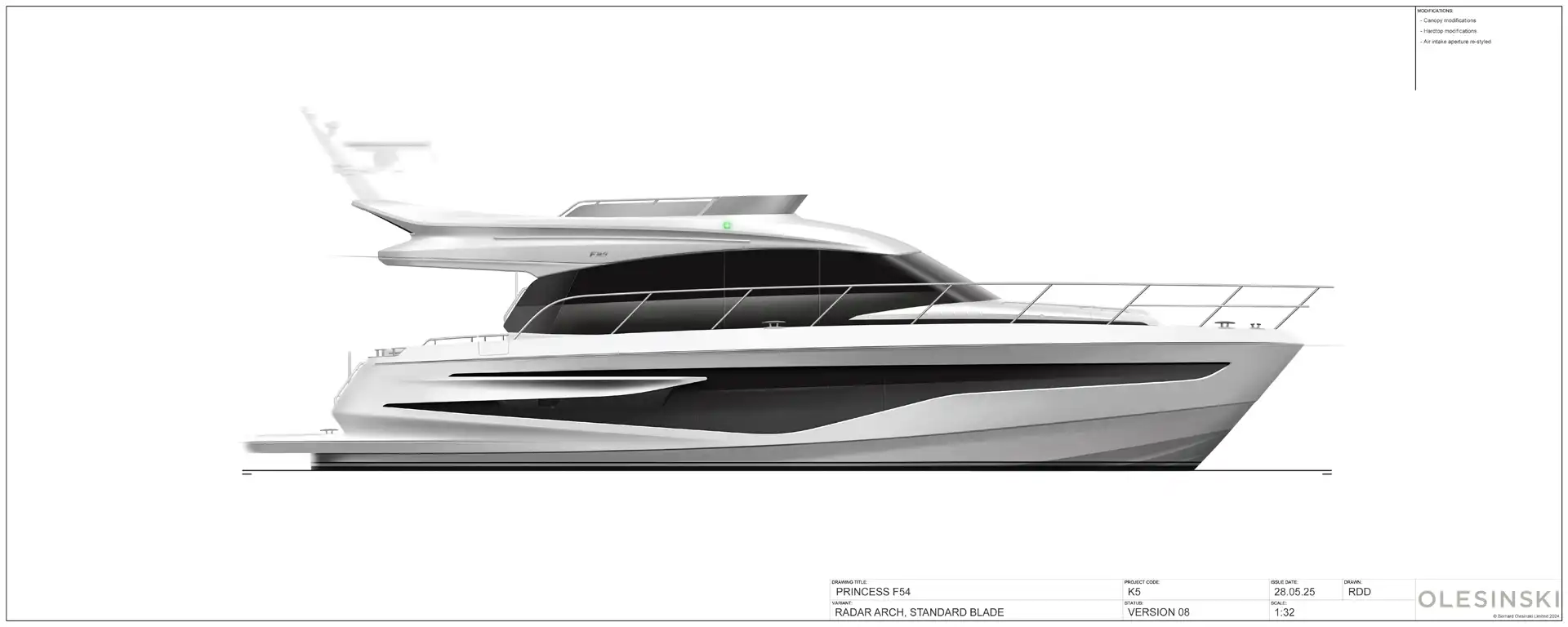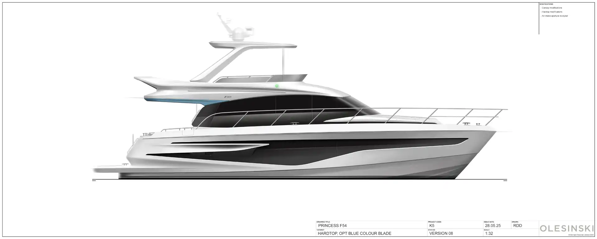 Mit zwei Volvo D13-900 Motoren erreicht die F54 bis zu 34 Knoten – und verbindet souveräne Leistung mit britischer Eleganz.