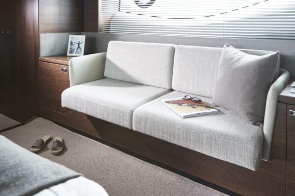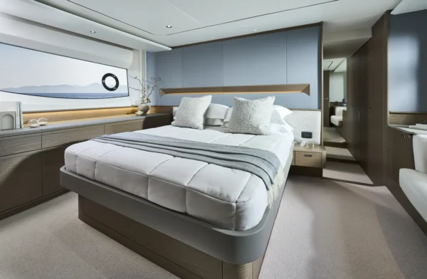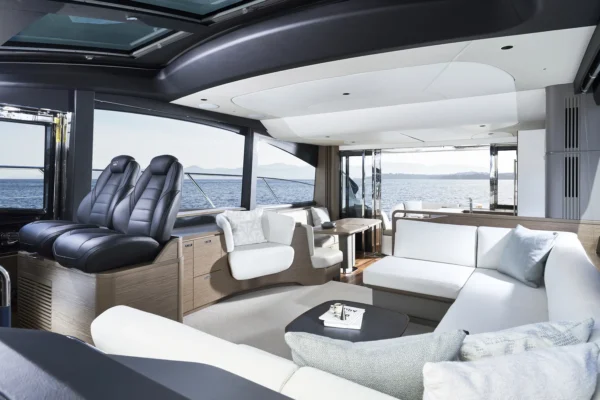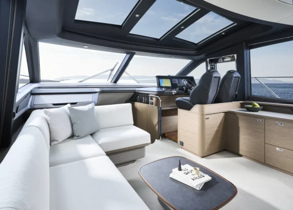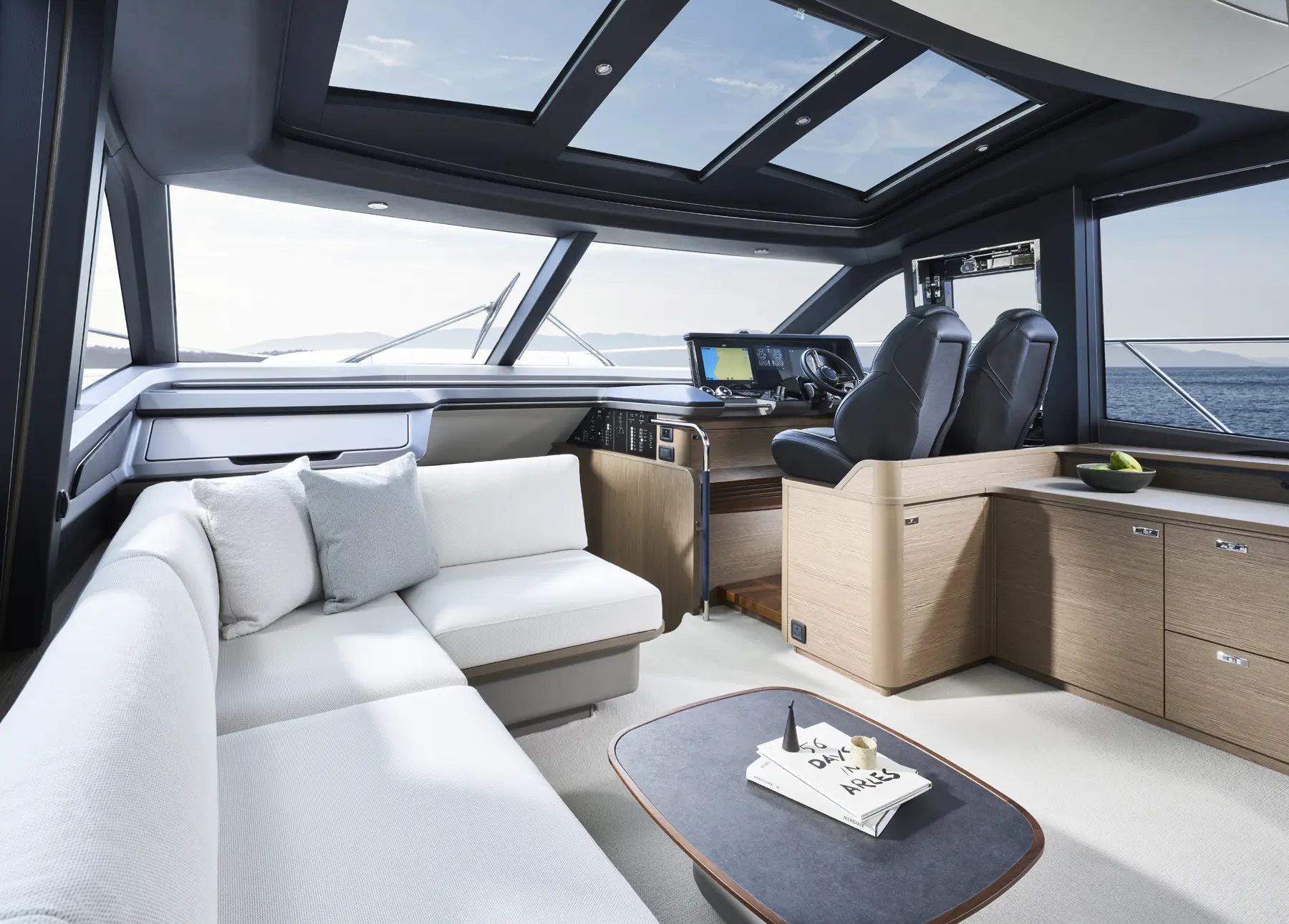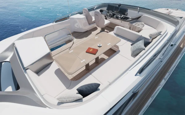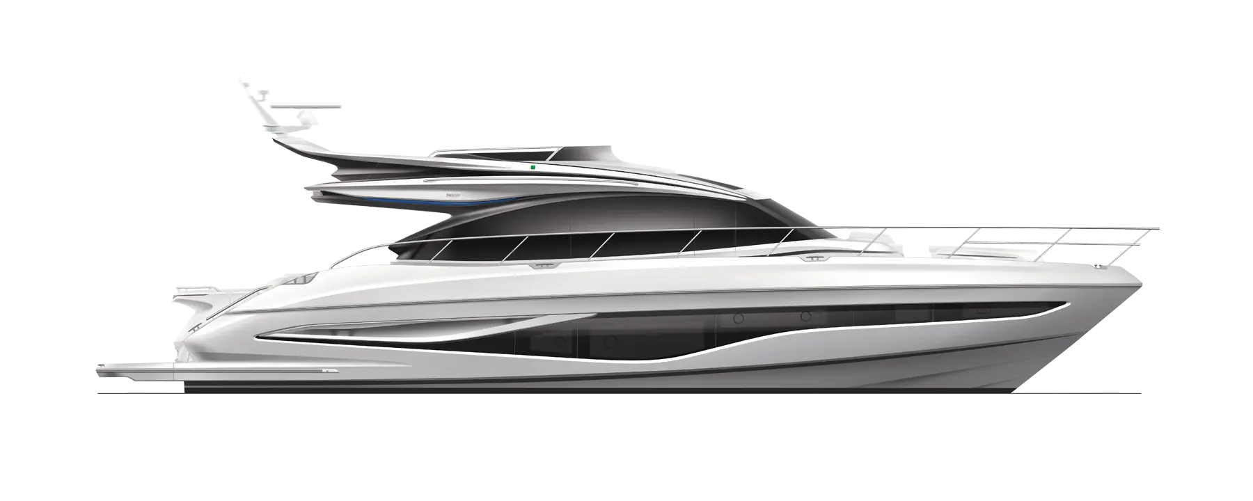 Mann kann die von der S65 ausgehende Aura einfach nicht abstreiten. Ihre schlanke, schnittige Form strahlt zudem eine fast raubtierhafte Eleganz aus. Der leichte, tiefe V-Rumpf untermalt diesen Eindruck noch mit atemberaubender Wendigkeit bei bis zu 36 Knoten. Vor Anker liegend breitet sich eine friedvolle Stimmung in den großzügigen Decksbereichen aus, beispielsweise auf dem geräumigen Sitzbereich auf dem Vordeck. Unterdessen werden die hydraulische Badeplattform und die 3,30 m lange Beibootgarage zu einer perfekten Basis für Wassersport.