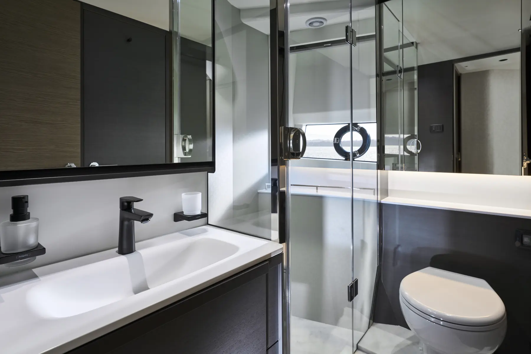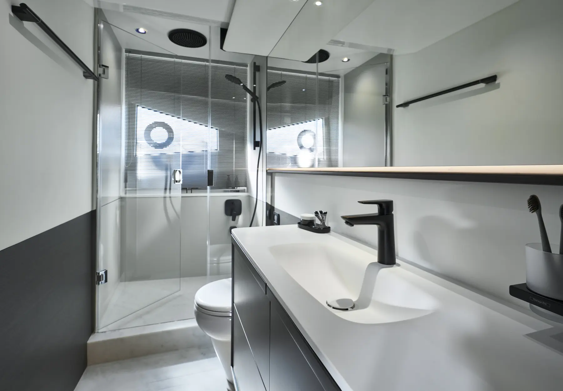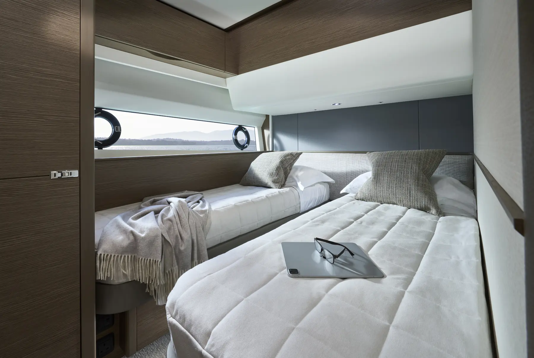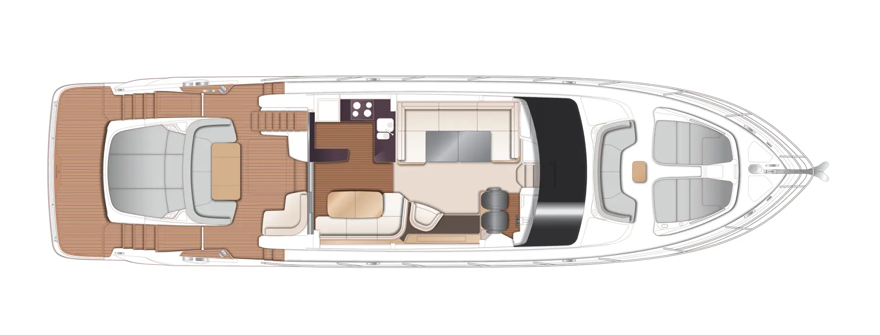 Mann kann die von der S65 ausgehende Aura einfach nicht abstreiten. Ihre schlanke, schnittige Form strahlt zudem eine fast raubtierhafte Eleganz aus. Der leichte, tiefe V-Rumpf untermalt diesen Eindruck noch mit atemberaubender Wendigkeit bei bis zu 36 Knoten. Vor Anker liegend breitet sich eine friedvolle Stimmung in den großzügigen Decksbereichen aus, beispielsweise auf dem geräumigen Sitzbereich auf dem Vordeck. Unterdessen werden die hydraulische Badeplattform und die 3,30 m lange Beibootgarage zu einer perfekten Basis für Wassersport.