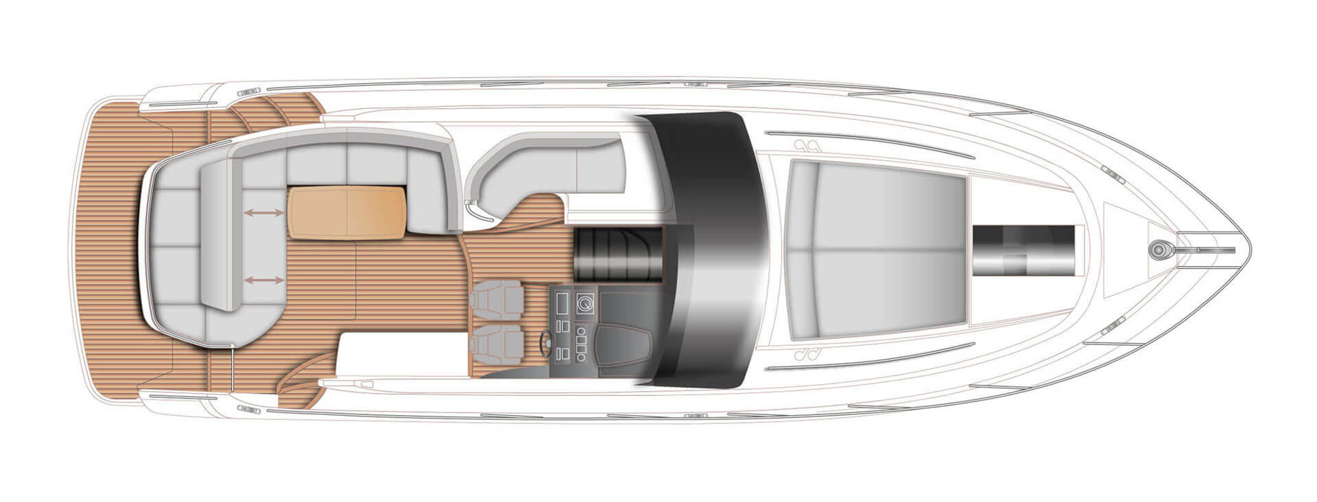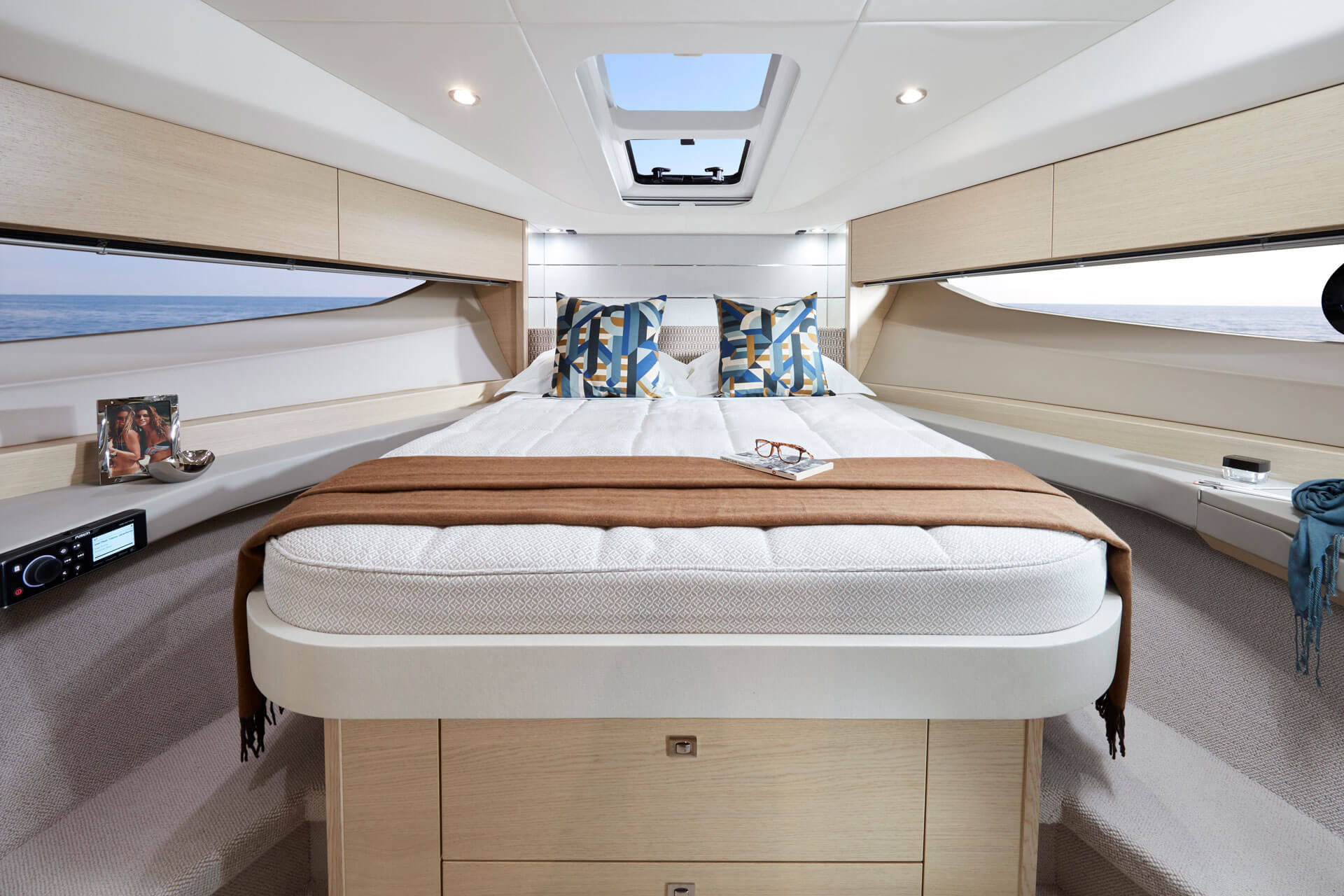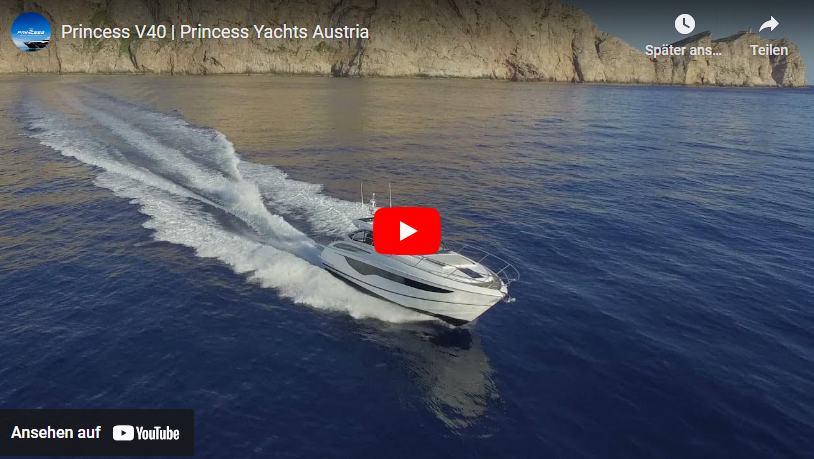Die V40 verkörpert das schlanke Exterieur, die Leistungskraft und außergewöhnliche Seetüchtigkeit der Princess V Class. Sich über die gesamte Länge des tiefen V-Rumpfes entlangziehende Fenster durchfluten Salon und die Kabinen mit Tageslicht. Das großzügige Cockpit bietet einen idealen Rahmen für geselliges Beisammensein, und wahlweise kann achtern ein zusätzlicher, umbaubarer Sonnenbereich konfiguriert werden.