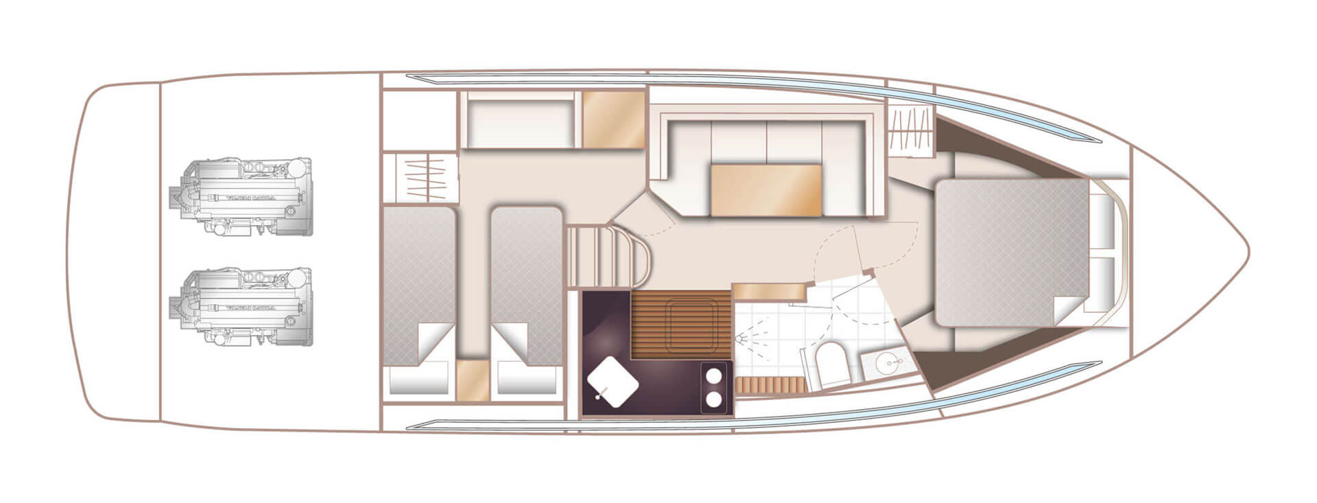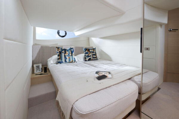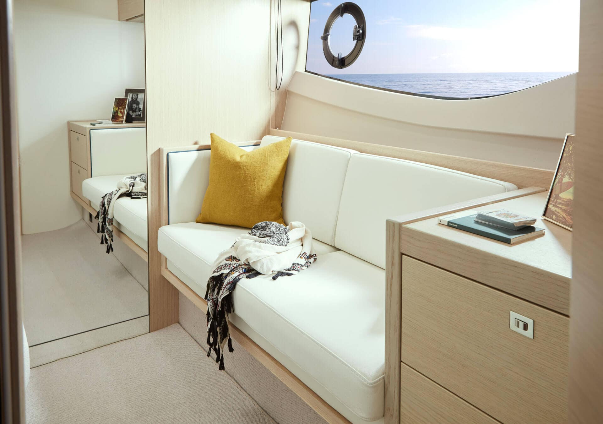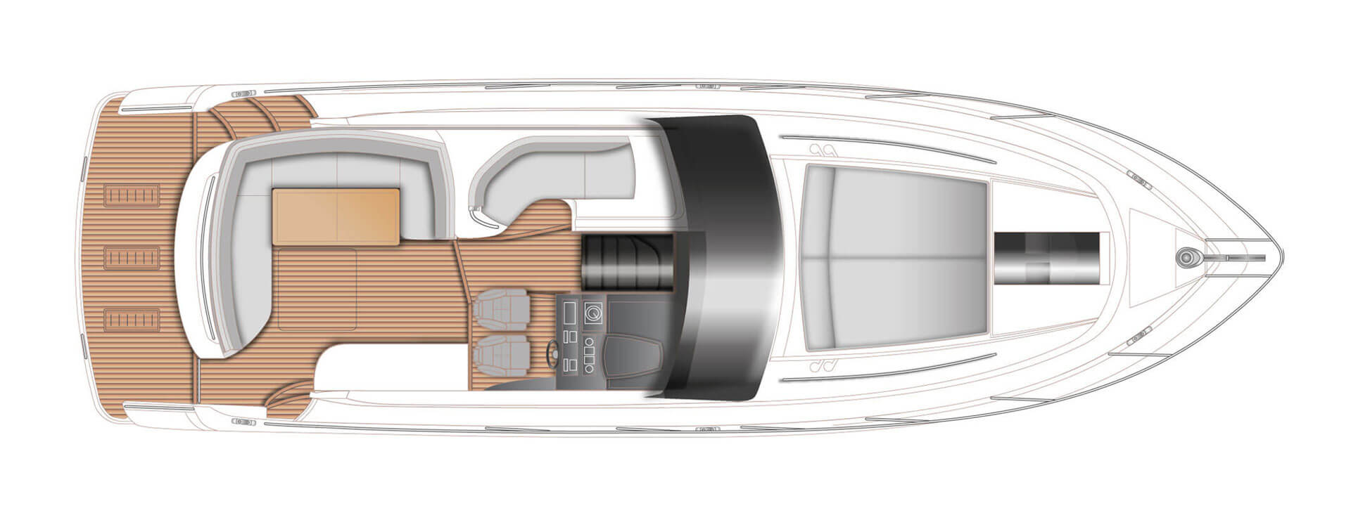Die V40 verkörpert das schlanke Exterieur, die Leistungskraft und außergewöhnliche Seetüchtigkeit der Princess V Class. Sich über die gesamte Länge des tiefen V-Rumpfes entlangziehende Fenster durchfluten Salon und die Kabinen mit Tageslicht. Das großzügige Cockpit bietet einen idealen Rahmen für geselliges Beisammensein, und wahlweise kann achtern ein zusätzlicher, umbaubarer Sonnenbereich konfiguriert werden.
