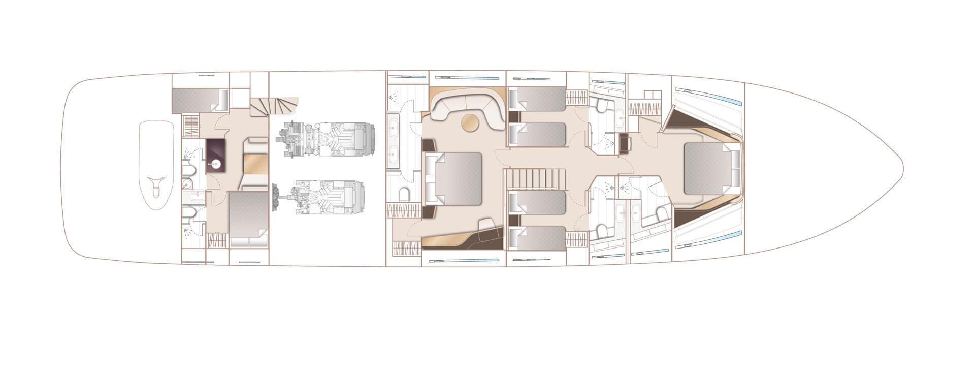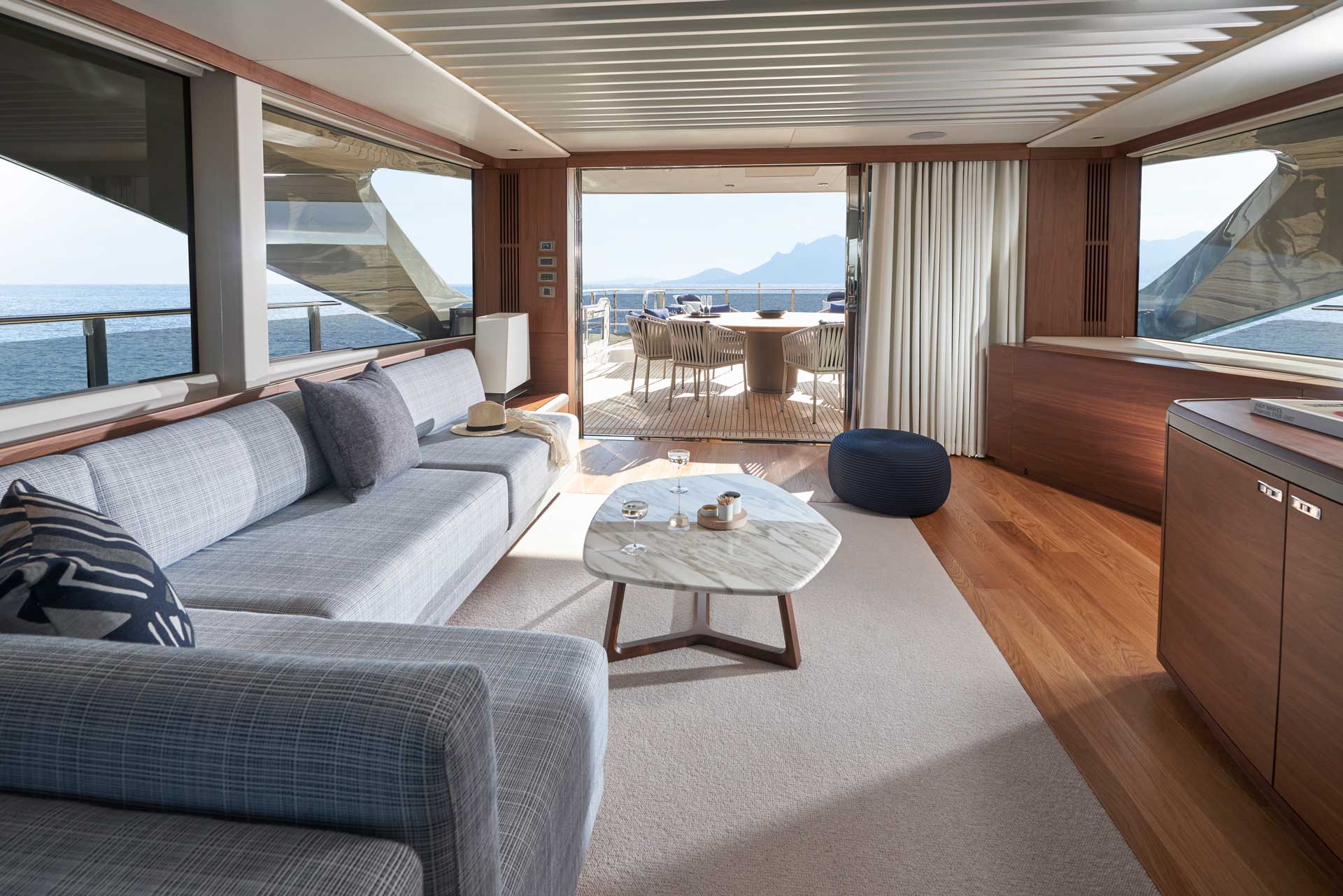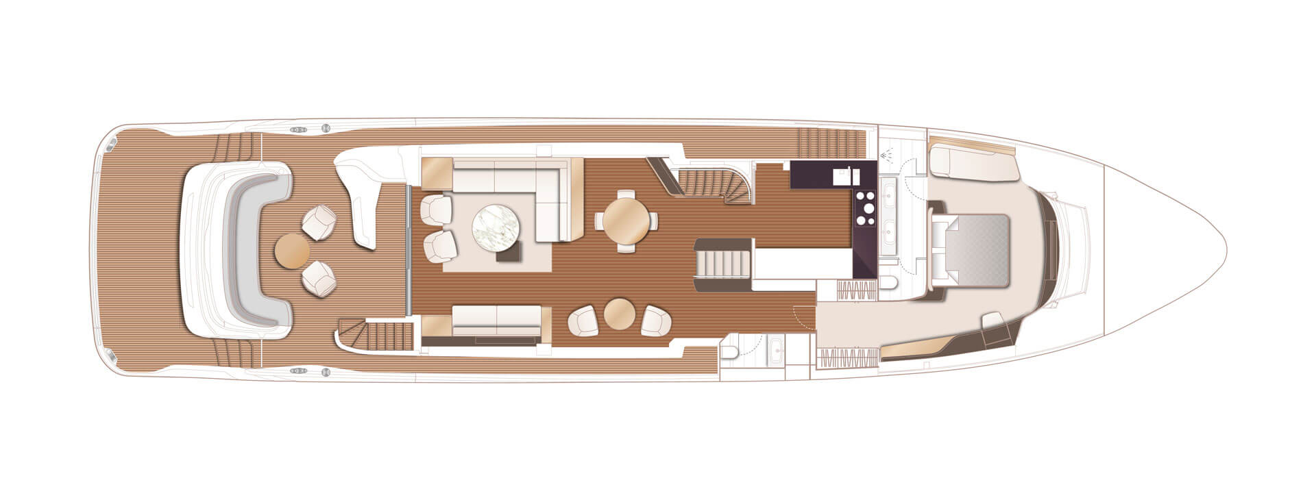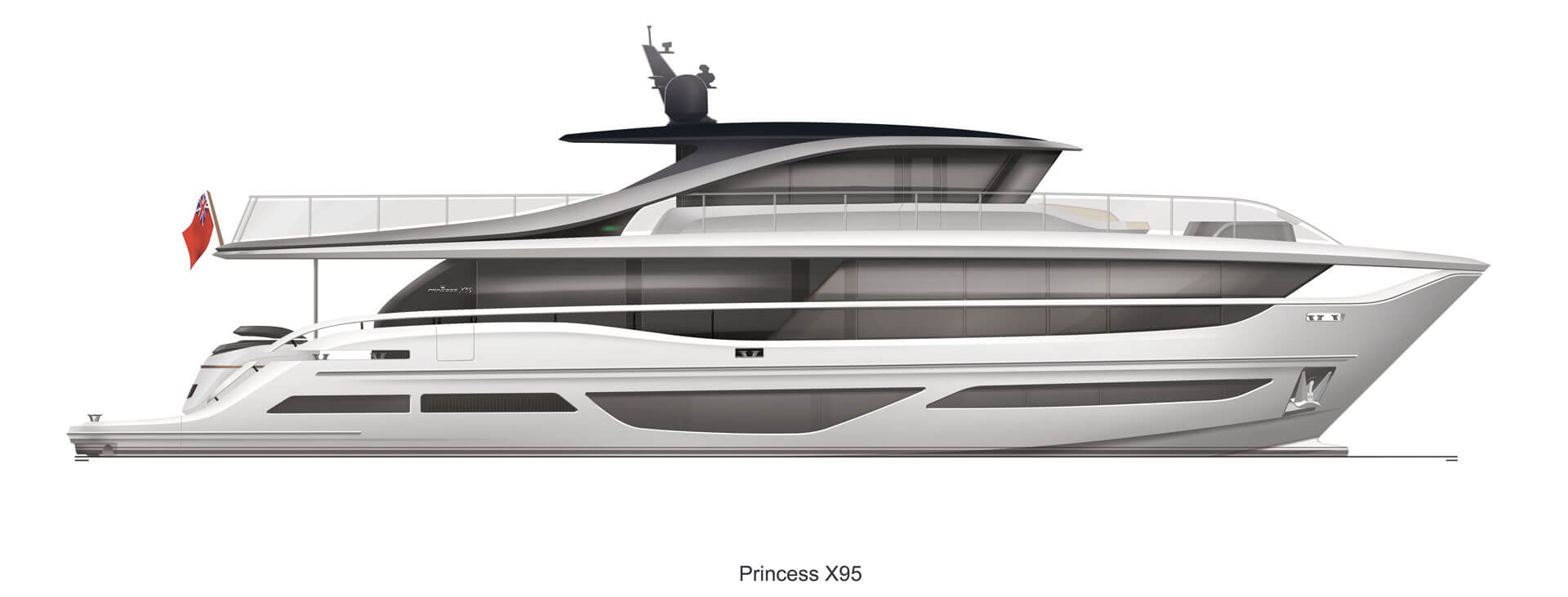 Die X95 zeichnet sich durch wunderschön modellierte Oberflächen und lange, fließende Linien aus und definiert so eine auffallende Designsprache für diese neue Klasse. Sowohl die Flybridge als auch das Hauptdeck erstrecken sich über fast die gesamte Länge der Yacht, wodurch flexible, großzügige Räumlichkeiten entstehen, die eine Ausrichtung jeder Ihrer Fahrten ganz nach den Vorlieben Ihrer Gäste ermöglichen. Die Kraftstoffkapazität von 13.818 Litern stattet die X95 mit der notwendigen Reichweite für lange, abenteuerliche Seereisen aus.Beim Betreten des Salons auf dem Hauptdeck eröffnet sich Ihnen ein Raumangebot, das einer Megayacht in nichts nachsteht - die Sichtlinie zieht sich geradeaus bis durch das Vorderfenster zum Horizont. Eine innenliegende Treppe führt Sie hinauf auf das Oberdeck, wo ein weiteres, einmaliges Erlebnis auf Sie wartet: eine vollständig geschlossene, klimatisierte Sky Lounge.Im Unterdeck erstreckt sich die Eignerkabine mit eigenem Bad über die volle Breite der Yacht, und im Bug befindet sich eine weitere Kabine mit begehbarem Kleiderschrank und eigenem Badezimmer. Die zusätzlichen Gästekabinen an Backbord und Steuerbord können individuell mit zwei Einzelbetten oder einem Doppelbett konfiguriert werden, und ein großzügiger Crewbereich ergänzt das exzellente Unterkunftsangebot dieser Yacht.