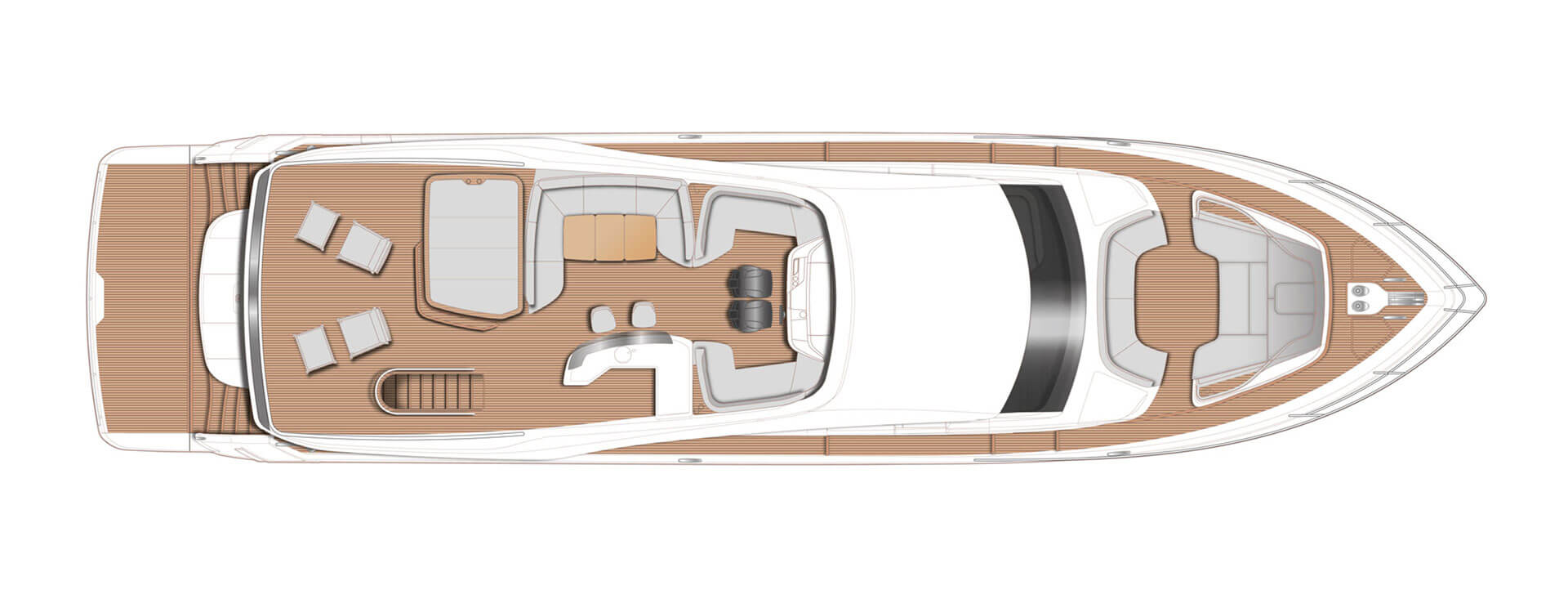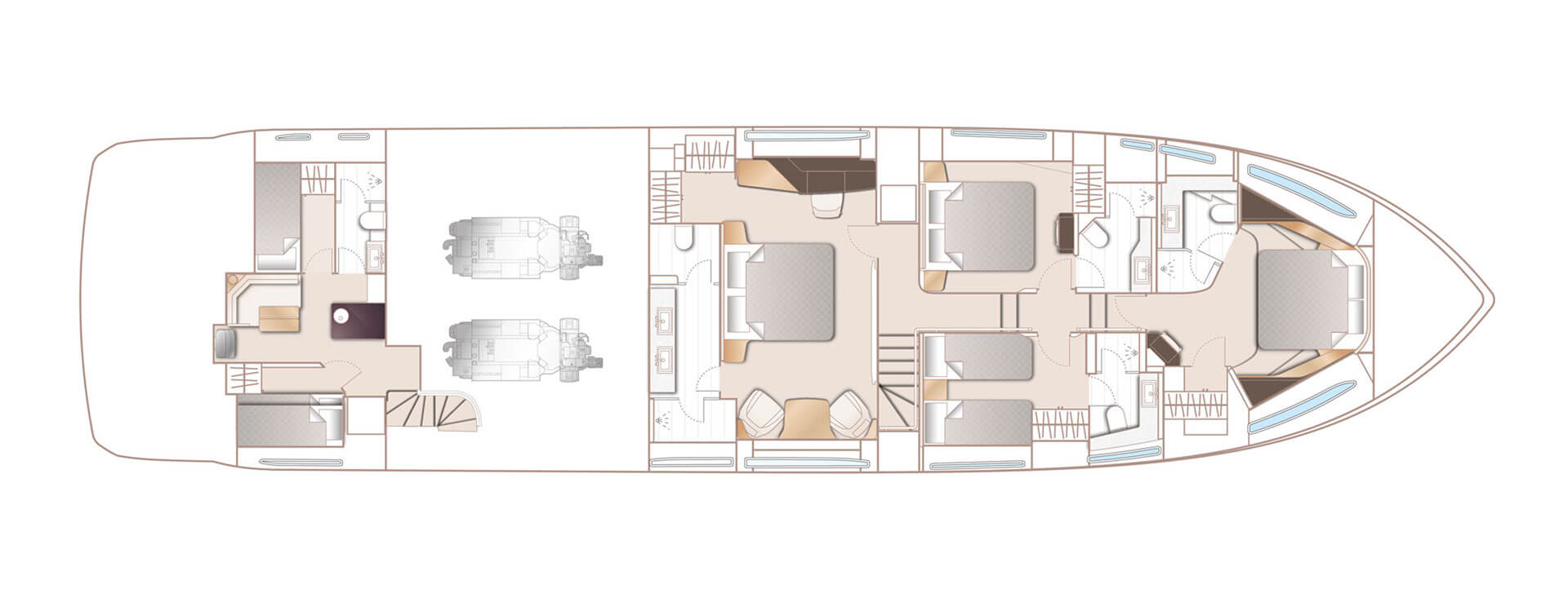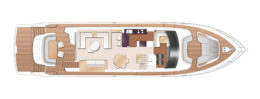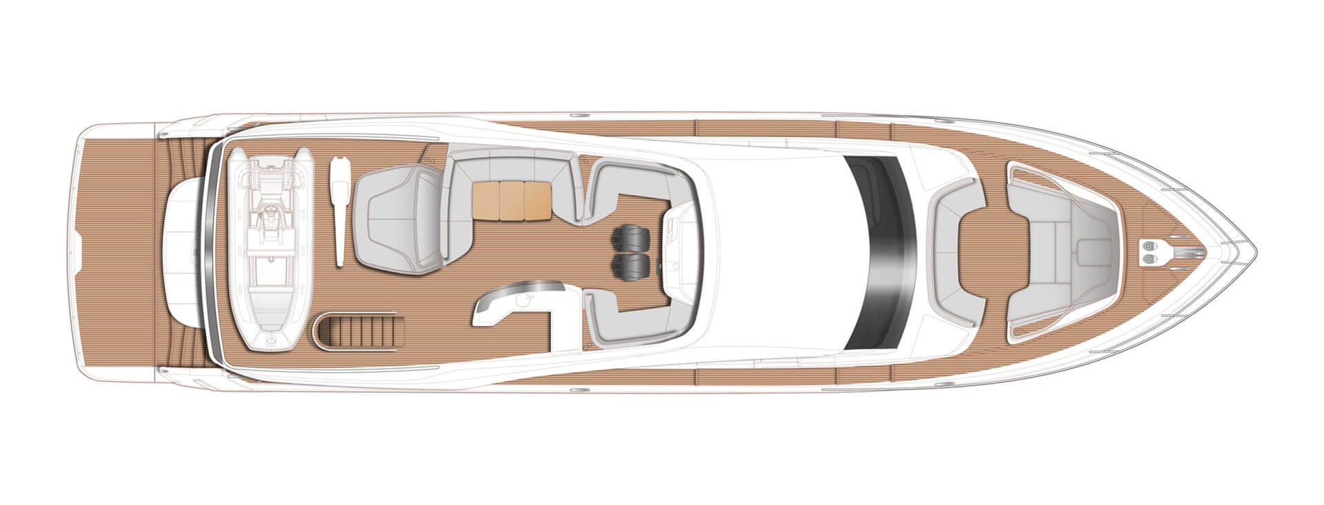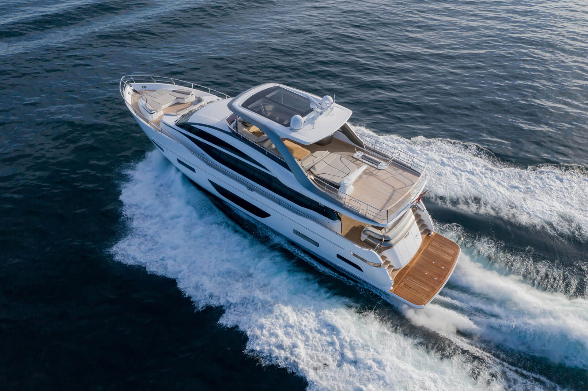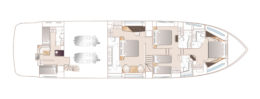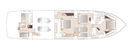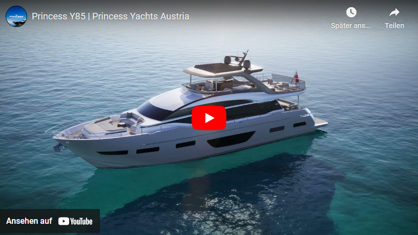 Die brandneue Y85 ist ein Triumph modernen Designs. Das elegant geschwungene Profil verbirgt im Inneren eine Zufluchtsstätte, die die Benchmark für modernen Lebensstil neu definiert. Mit einem großen Essbereich, einer gut ausgestatteten Bar sowie einem großzügigen Sonnenbereich achtern lädt die Flybridge zu geselligen Runden im Freien ein, denen man schwer widerstehen kann. Ohne sich umzudrehen schneidet diese Yacht dank ihrer beiden MAN V12 Motoren mit einer Spitzengeschwindigkeit von 33 Knoten an ihren Zeitgenossen vorbei durch das Wasser. Das weitläufige, einstöckige Hauptdeck bietet mit flexiblem Kombüsen-Arrangement ausreichend Platz zur Unterhaltung. Drei separate Sitzbereiche sorgen für größtmögliche Privatsphäre der Gäste, und die Crew kann sich diskret durch die Yacht bewegen. Unter Deck finden bis zu acht Gäste in vier wundervoll eingerichteten Kabinen mit eigenem Bad Platz. Mitschiffs erstreckt sich die Eignerkabine über die volle Breite der Yacht - ein Meisterwerk raumgreifenden Designs. Bugwärts befindet sich die VIP-Kabine mit eigenem Bad, großem Doppelbett und begehbarem Kleiderschrank. Darüber hinaus vervollständigen eine Doppelkabine und eine Kabine mit zwei Einzelbetten (zu einem Doppelbett umwandelbar) die großzügigen Schlafbereiche dieser Yacht. Es ist nicht zu übersehen, dass die brandneue Y85 unverkennbar eine Princess ist.