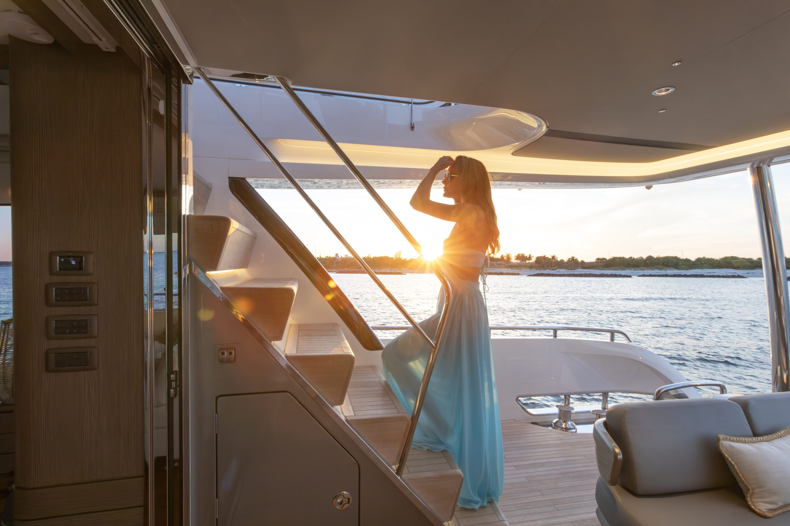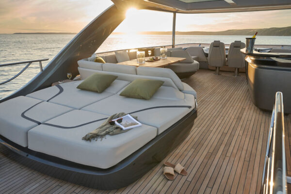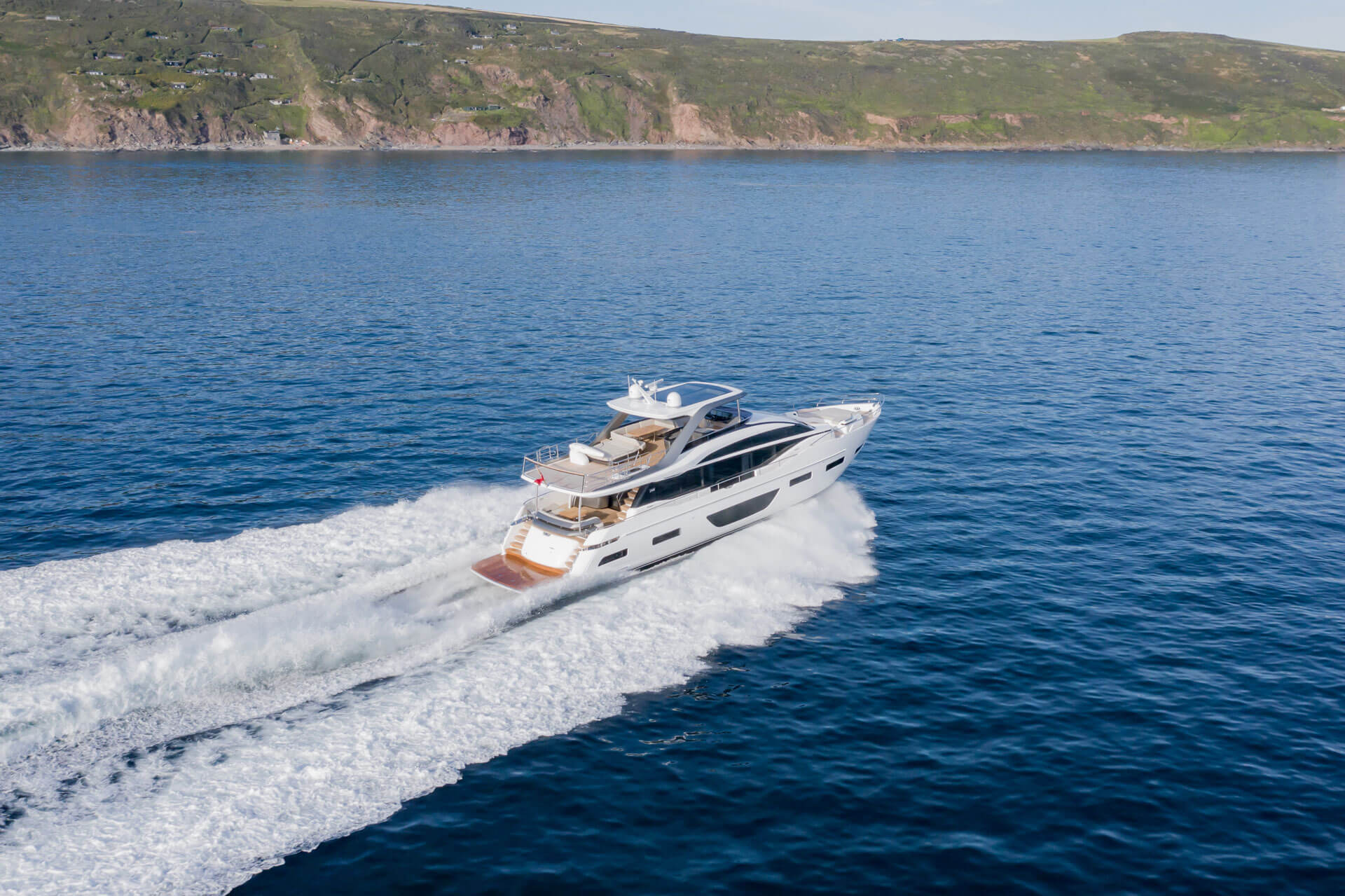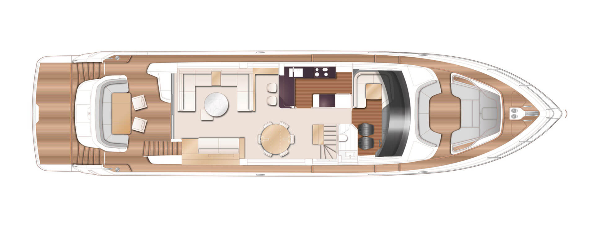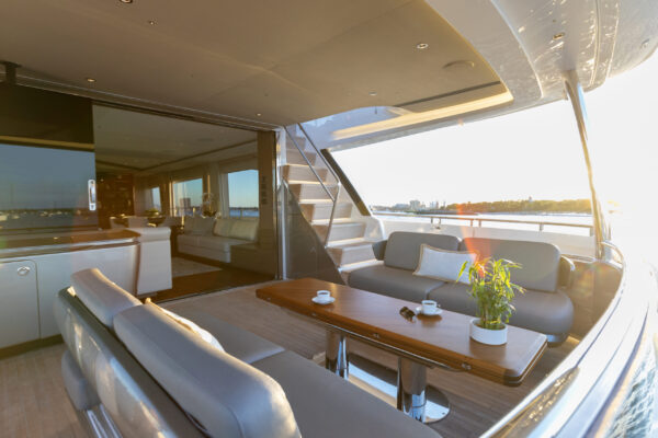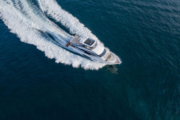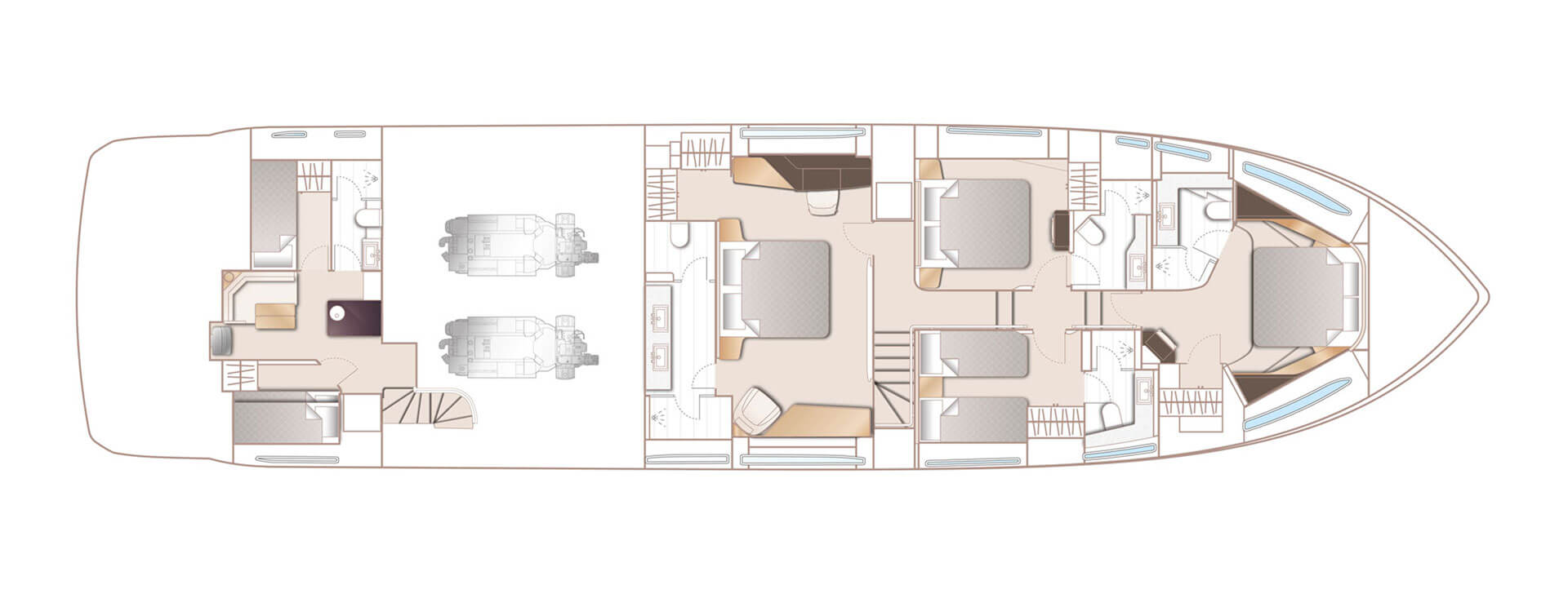 Die brandneue Y85 ist ein Triumph modernen Designs. Das elegant geschwungene Profil verbirgt im Inneren eine Zufluchtsstätte, die die Benchmark für modernen Lebensstil neu definiert. Mit einem großen Essbereich, einer gut ausgestatteten Bar sowie einem großzügigen Sonnenbereich achtern lädt die Flybridge zu geselligen Runden im Freien ein, denen man schwer widerstehen kann. Ohne sich umzudrehen schneidet diese Yacht dank ihrer beiden MAN V12 Motoren mit einer Spitzengeschwindigkeit von 33 Knoten an ihren Zeitgenossen vorbei durch das Wasser. Das weitläufige, einstöckige Hauptdeck bietet mit flexiblem Kombüsen-Arrangement ausreichend Platz zur Unterhaltung. Drei separate Sitzbereiche sorgen für größtmögliche Privatsphäre der Gäste, und die Crew kann sich diskret durch die Yacht bewegen. Unter Deck finden bis zu acht Gäste in vier wundervoll eingerichteten Kabinen mit eigenem Bad Platz. Mitschiffs erstreckt sich die Eignerkabine über die volle Breite der Yacht - ein Meisterwerk raumgreifenden Designs. Bugwärts befindet sich die VIP-Kabine mit eigenem Bad, großem Doppelbett und begehbarem Kleiderschrank. Darüber hinaus vervollständigen eine Doppelkabine und eine Kabine mit zwei Einzelbetten (zu einem Doppelbett umwandelbar) die großzügigen Schlafbereiche dieser Yacht. Es ist nicht zu übersehen, dass die brandneue Y85 unverkennbar eine Princess ist.